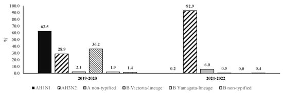 The AH1N1 strain was predominant in the 2019–2020 season, and it was isolated in nearly two-thirds (62.5%) of cases (Figure 2). The B Victoria lineage and AH3N2 strains were identified in 36.2% and 28.9% of patients, respectively. During the latest influenza season (2021–2022), AH3N2 became clearly predominant and caused more than nearly 93% of infections. In addition, during the 2021–2022 season, the AH1N1 and B Victoria lineage strains were isolated in 2 and 5 out of 1000 PCR-confirmed cases, respectively.