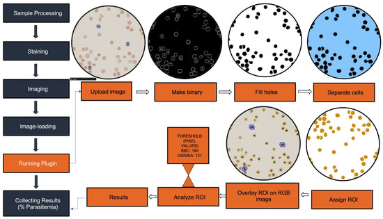 Flow chart and image analysis of automated NanoZoomer malaria counting ParasiteMacro. The acquired images were uploaded to imageJ and the created plugin was run.