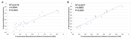 Scatter plots for association of parasitemia determined by automated counting NanoZoomer ParasiteMacro algorithm versus manual counting. (A) The HB3 (high parasitemia) strain showed a Pearson correlation coefficient of 0.8179, p < 0.0001, (B) while the 7G8 strain (low parasitemia) showed a Pearson correlation coefficient of 0.9377, p < 0.0001.