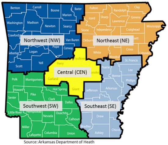 Geographical regions used for reporting the numbers of cases of S. Javiana. The regions are defined by the Arkansas Department of Health, the source of the isolates for the current study.