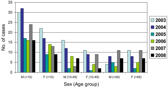 Approximately 43% of the strains were isolated from female subjects (Table 2). Additionally, 54% of the bacterial strains were isolated from patients <10 years old. Approximately 48% of S. Javiana isolates were isolated from 2003 to 2004, while the frequency of isolation decreased and remained nearly flat from 2005 to 2008. It appeared that regardless of the year of detection, children under the age of 10 displayed the highest prevalence of infections (Figure 2).
