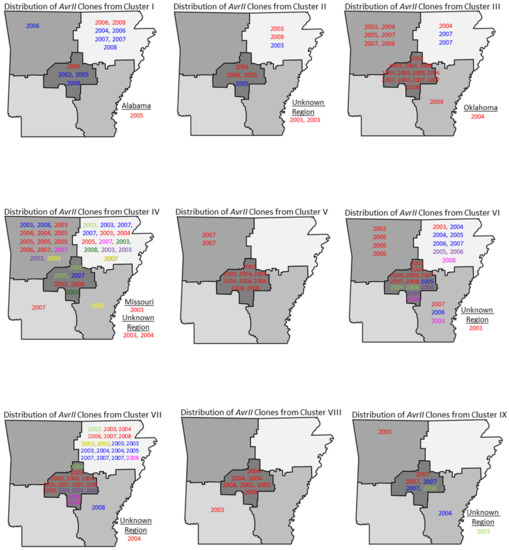 Geographical and temporal distribution of S. Javiana “types” based on XbaI and AvrII PFGE analyses. The nine clusters are defined based on identical XbaI PFGE profiles based on the analyses shown in Supplemental Figure S1. Among the clusters, isolates with common colors in each subfigure represent isolates with identical AvrII profiles (i.e., types) and the year indicates the year of isolation.