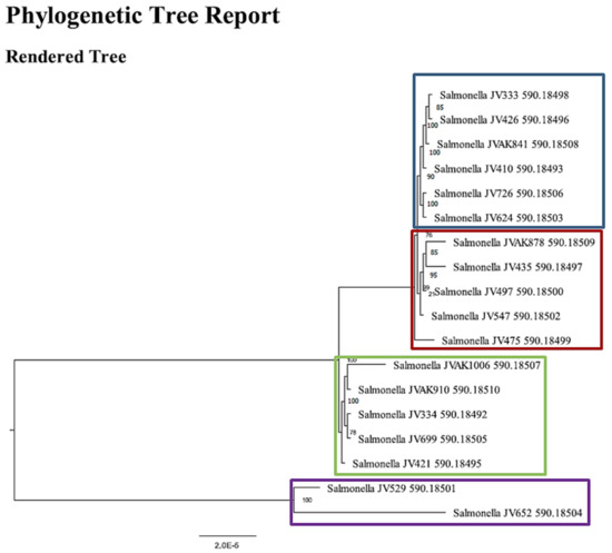 SNP analysis revealed the genetic structure of S. Javiana isolates clustered based on the geographic origin of Arkansas (Figure 6, blue, green, and purple box). Similarly, in the previous study, S. Typhimurium isolates clustered in three monophyletic groups based on host origin [42].