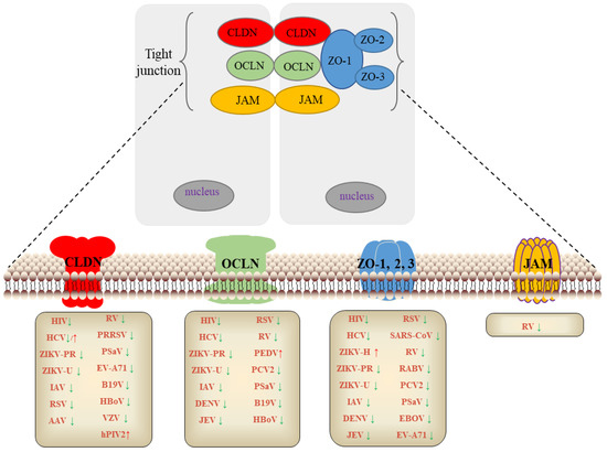 | Viruses | Viral Genome | Model/Cells | Tight Junctions | Up/Down Regulate | Effects on Virus Infection | References |