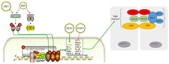 | RABV | Negative ssRNA | BHK-21 | ZO-1 | ↓ IFN-λ is regulated by RABV, which maintains ZO-1 expression in the BBB, thus ensuring the integrity of the TJ | Inhibiting | [55] |