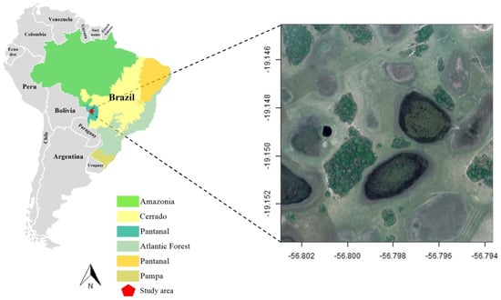 The study was conducted in a private ranch in the center of Brazilian Pantanal, Nhecolândia sub-region, in Corumbá municipality (Figure 1). Pantanal is unique in geomorphological formations that can be divided into 11 sub-regions [31], among which is the Nhecolândia, an area characterized by a mosaic of vegetation composed mainly of a seasonally flooded grassland and patches of semi-deciduous forest, with some shrub vegetation. The forested area is located at higher elevations, referred to as “cordilheiras” (long strings of forest), that remain unflooded during the rainy season. The ground is composed mainly of leaf litter, and the canopy is discontinuous, reaching about 5–6 m in the central zones [32]. The understory is composed mainly of spiny bromeliads (Bromelia balansae) on the edges and Acuri palms (Attalea phalerata) inside, which attain heights of approximately 1–2 m [33]. The climate is marked by two distinct seasons: the rainy season (October to March) and the dry season (April to September).