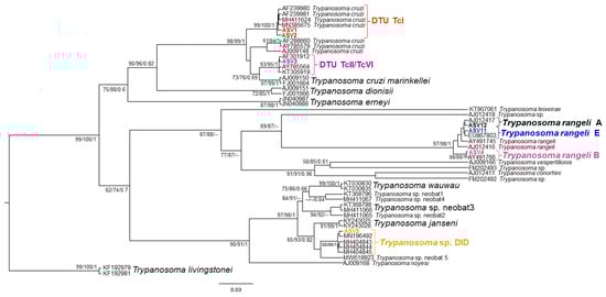 Trypanosoma cruzi clade phylogenetic tree based on 18S rDNA gene for liver, spleen, and blood clot DNA pool from different small mammal species. The trees were inferred with the transition model plus gamma distribution among sites (TIM3 + G). The number of nodes correspond to ML (ultrabootstrap and SH-aLRT) and BI (posterior probability). The scale bar shows the number of nucleotide substitutions per site. The red bracket indicates the group formed by T. cruzi DTU TcI; the lilac bracket indicates the sequences grouped as T. cruzi DTU TcII/TcVI; the black, blue, and pink brackets indicate the sequences identified as T. rangeli lineages A, E, and B, respectively; and the yellow bracket indicates the sequences identified as Trypanosoma sp. DID.