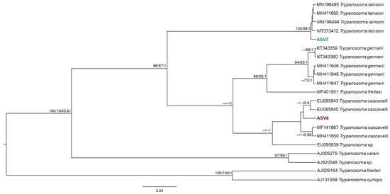 Trypanosomatid of reptile and mammals’ clade phylogenetic tree based on 18S rDNA gene for liver, spleen, and blood clot DNA pool from different small rodent species. The phylogenetic tree was inferred with the transition model plus gamma distribution among sites (TIM3 + G). The number of nodes correspond to ML (ultrabootstrap and SH-aLRT) and BI (posterior probability). The scale bar shows the number of nucleotide substitutions per site. The ASV6 grouped together with other T. cascavelli sequences from marsupial species. The ASV7 grouped with T. lainsoni sequences from different mammal species and biomes.