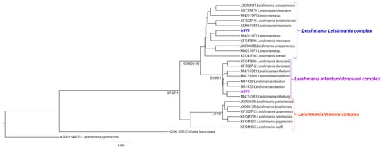 Leishmania spp. phylogenetic tree based on 18S rDNA gene for liver, spleen, and blood clot DNA pool from different small mammal species. Phylogenet tree was inferred with the transition model plus gamma distribution among sites (TIM3 + G). The number of nodes correspond to ML (ultrabootstrap and SH-aLRT) and BI (posterior probability). The scale bar shows the number of nucleotide substitutions per site. The blue, purple, and red brackets correspond to the Leishmania (Leishmania), L. infantum/donovani, and L. (Viannia) complexes, respectively. The ASV8 grouped with Leishmania sequences from the Leishmania (Leishmania) complex, and the ASV9 grouped with Leishmania sequences from the Leishmania infantum/donovani complex.