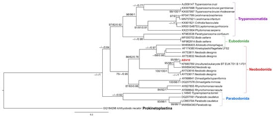 Kinetoplastea class phylogenetic tree based on 18S rDNA gene for liver, spleen, and blood clot DNA pool from different small mammal species. Phylogenet tree was inferred with the PM1 uf model plus gamma distribution among sites (TPM1 uf + G). The number of nodes correspond to ML (ultrabootstrap and SH-aLRT) and BI (posterior probability). The brackets’ colors correspond to the following trypanosomatid orders: purple—Trypanosomatida; green—Eubodonida; red—Neobonida; blue—Parabodonida. The ASV10 grouped together with Neobodo sequences from the Neobonida order.