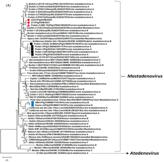 Since the partial pol sequences of the PAdV-5 strains from Cabrera, Pedro Brand and Villa Mella were closely related to each other (deduced aa identities of 98.78–100% between themselves, and phylogenetically, formed a tight cluster (Supplementary Figure S3)), we selected two samples (GES7 and Z11 from 2020 and 2021, respectively) that were only available in sufficient volumes for obtaining the full-length CDS for the putative AdV hexon and pol. The AdV hexon is the major viral capsid protein, which plays an important role in eliciting host immune responses [27], whilst the AdV pol participates in viral DNA replication [28]. Phylogenetic analysis of the pol constitutes an important basis for taxonomic classification of AdVs [1]. The complete deduced aa sequences of the putative hexon (910 aa) of GES7 and Z11 shared identities of 99.67% between themselves, and 99.78% and 99.89%, respectively, with that of PAdV-5 reference strain HNF-70 (Supplementary Figure S4), followed by identities of 82.46–85.92% with those of AdVs belonging to the species Bovine mastadenovirus A (BAdV-A), caprine mastadenovirus and Ovine mastadenovirus A (OAdV-A) and B (OAdV-B). Deduced aa identities of 73.19–75.88% and 65.25–65.38% were observed with the hexon of PAdV-A (PAdV-3) and PAdV-B, respectively. Phylogenetically, the hexon of GES7 and Z11 grouped with PAdV-5 isolate HNF-70 within a clade that consisted of two clusters of ruminant AdVs assigned to BAdV-A, OAdV-A and OAdV-B (Figure 1A).
