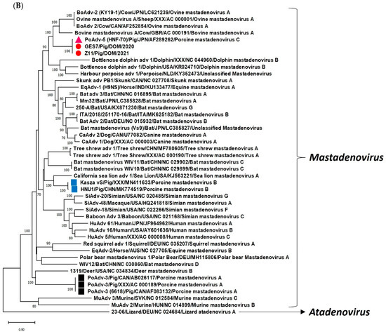 Phylogenetic analysis of the full-length deduced amino acid (aa) sequences of the putative hexon (A) and DNA-dependent DNA polymerase (pol) (B) of porcine adenovirus serotype 5 (PAdV-5) (species Porcine mastadenovirus C (PAdV-C)) strains GES7 and Z11 with those of other adenoviruses. The virus name/host/country/year are shown for GES7 and Z11, whilst the virus name (isolate name)/host/country/year/GenBank accession number/virus species have been mentioned for the other AdV strains. Red circles, a pink triangle, black, and blue squares indicate the PAdV-5 strains GES7 and Z11, the PAdV-5 reference strain (isolate HNF-70), viruses belonging to the species PAdV-A, and -B, respectively. A member of the genus Atadenovirus was used as the outgroup sequence. Bootstrap values < 70% are not shown. Scale bar, 0.5 substitutions per aa. Abbreviations: AdV, adenovirus; Bo, bovine; Ca, canine; Cap, caprine; Eq, equine; Hu, human; Mu, murine; Ov, ovine; PAdV, porcine adenovirus; Si, simian.