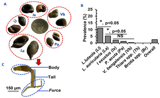 Comparative prevalence of SC in different species of snails in Bangladesh. (A) Species of the snails infected by Schistosoma spp. in Bangladesh. (B) Infection rates of SC in different snail species. * p < 0.05 were statistically significant. NS; statistically insignificant (p > 0.05). (C) A microphotograph of SC showing its characteristic features.