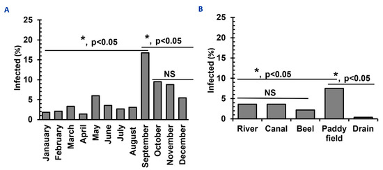 Temporal distribution and habitat diversities of Schistosomatid-infected vector snails in Bangladesh. (A) Temporal distribution of infections with schistosomatids in vector snails. (B) Habitat preference of vectors of SC. * p < 0.05 are statistically significant. NS, statistically insignificant (p > 0.05).