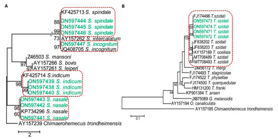 Dendrograms showing species-specific clusters of sequences. (A) A 28S rRNA-based dendrogram showing different species of schistosomatids affecting mammals. (B) A cox1 gene-based dendrogram of schistosomatids affecting birds. Phylogenetic trees were constructed using maximum likelihood (ML) methods in MEGA X.