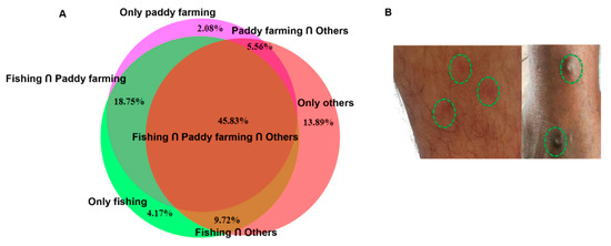 A study was conducted using a structured questionnaire among individuals living in the river basin or around wetlands. Four hundred individuals participated in this survey, and the purpose of the study was clearly described to the participants in a language in which they were fully conversant. In a written consent letter, we confirmed that confidentiality about the personal information of participants would be strictly maintained, and the personal information of participants would not be handed over to a third party. We collected information only from individuals who willingly signed the consent letter. A history of HCD was revealed via interviewing the participants and close inspections. Itching that started at least 30 min after contact with natural water bodies was considered as to be HCD. Individuals with a history of pre-existing skin diseases were requested not to participate in the study. Participants willingly described their experiences. Photographs were taken only after the prior permission of participants. Since most of the participants in the present study were engaged in multiple professions, we constructed a Venn diagram using Bio-Venn software (https://www.biovenn.nl/index.php; accessed on 20 May 2022) to show the distribution of conditions in different professions.
