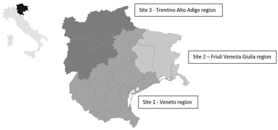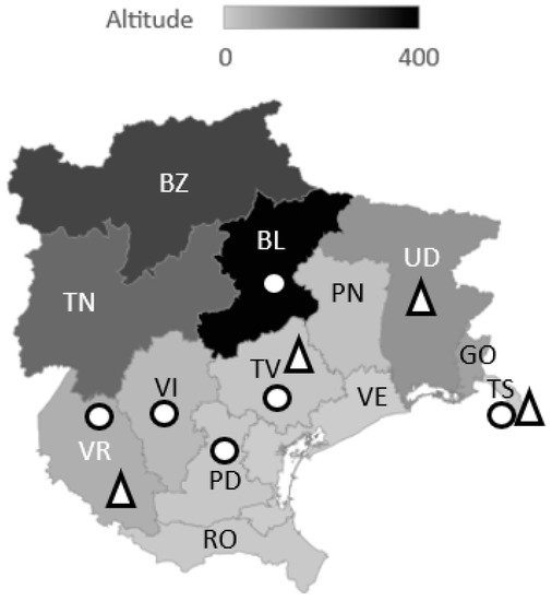 The investigated areas included the Veneto (Site 1), Friuli Venezia Giulia (Site 2), and Trentino Alto-Adige (Site 3) regions (Figure 2). Mean altitudes of the different provinces are represented in Figure 1.