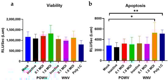 Cell viability and apoptosis in POWV- and WNV-infected hNSC-derived neuron/astrocyte co-cultures. Co-cultures were infected with either 0.1 MOI or 1.0 MOI of POWV or WNV and assayed for (a) cell viability or (b) apoptosis. After 72 h, assays were performed using a ProMega ApoTox/Glo kit and measured on a BioRad Cytation 7 reader. Poly I:C treatment was included as positive control, heat-inactivated virus as negative control. Infected samples and poly I:C samples were compared to the mock samples using an unpaired t-test with Welch’s correction. Average data from biological triplicates are shown. * p ≤ 0.05, ** p ≤ 0.01.