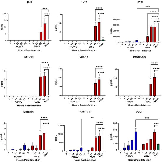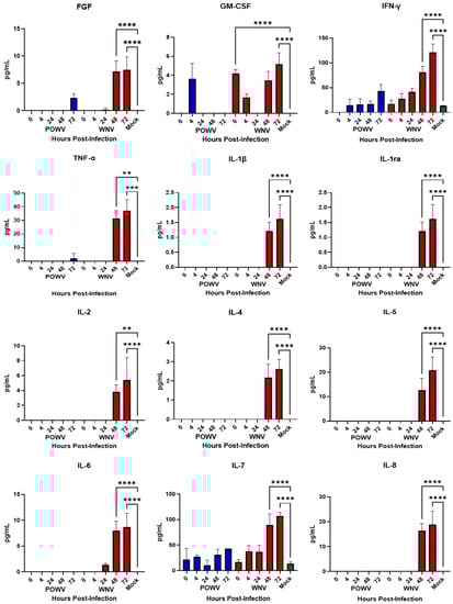 Inflammatory cytokines released by neurons and astrocytes have been noted to play a role in pathogenesis during flaviviral encephalitis [,,,,,,,]. After demonstrating that hNS-derived neuron/astrocyte co-cultures are susceptible to infection with either POWV or WNV, we wanted to determine their cellular immune responses to infection. Supernatants from co-cultures infected with 1.0 MOI of either POWV or WNV were collected at 4-, 24-, 28- and 72-h post-infection and tested for translational changes in pro-inflammatory cytokines and chemokines (Figure 3) using the BioPlex human 27-plex cytokine panel. Previously, ability of the co-cultures to respond to an external stimulus was demonstrated [] and confirmed here using Poly I:C as a positive control. Overall, cellular innate immune responses to POWV infection were weak, with multiple readings below the limit of detection, except for IFN-g and IL-7. Elevated pro-inflammatory cytokine levels were detected for WNV infection at 48- and 72-h post-infection, with key inflammatory cytokines IL-1β, TNF-α, IL-6 and IL-8 showing a statistically significant increase. Chemokine responses were also strong in WNV-infected co-cultures at 48- and 72-h post-infection. Responses to POWV were elevated in several chemokines, most notably VEGF, which was consistent with the levels of chemokines triggered by WNV. This is consistent with the levels of pro-inflammatory cytokines (IL-1β, IL-8, IL-8, TNF-α) produced during WNV infection of the neuronal cell line SK-N-SH []. These findings correlate with the apoptosis data for WNV, signifying that an inflammatory response might be driving caspase cleavage, while a reduced inflammatory response might be tied to lower apoptosis, as observed for POWV.