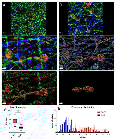 While POWV can cause serious CNS disease and has been shown to induce strong inflammatory responses [], there is currently no evidence that POWV causes direct damage to neurons. Imaging of neuron/astrocyte co-cultures infected with POWV reveal that neurons still show intact axons and dendrites that appear similar to mock controls (Figure 1b and Figure 5a). At lower magnifications (20×), no cellular debris or apoptotic bodies were observed, and neuronal processes are formed and unfragmented, despite the presence of viral antigens in both neurons and astrocytes. At higher magnification (63×), two apparent differences are detected in the distribution of POWV as compared to WNV: (i) aberrations are forming in the dendrites of infected neurons and (ii) POWV is present in dendrites, while WNV was confined to the neuronal bodies (Figure 4a and Figure 5b). The spread into dendrites perpetuates the formation of aberrations in the dendrites as the swelling of the dendrites is caused by areas of virus located within these anomalies (Figure 5c). It appears that POWV is not causing obvious CPE and after image processing, it can be visualized that POWV is contained within the cells, especially dendrites (Figure 5d). Further isolation of the swollen dendrite areas highlights that the presence of POWV results in the formation of distinct structures, which appear to be consistent with previous findings describing laminal membrane structures (LMS) in murine primary neurons (Figure 5e) [,]. This phenomenon can be found in other regions of human neurons as well, recapitulating the formation of LMS in human neurons by POWV (Figure 5f). While the uninfected MAP2-stained co-cultures showed puncta which resembled the ones observed in POWV-infected cells, measurements of these puncta were found to be larger and have a wider size distribution in infected cells (Figure 5g,h and Figure S4). The mean size of the aberrations was found to be significantly larger at 5.3 µm, compared to the mean size of the puncta in MOCK neurons at 2.3 µm.