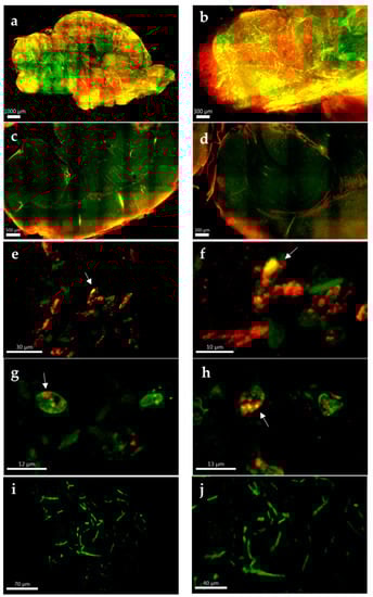 The formation of LMS in TBEV-infected murine primary neurons in vitro has previously been reported []; however, no published study yet has evaluated if formation of LMS also occurs in TBEV infection in vivo. We utilized tissue clearing and whole organ imaging to test if intracellular LMS can be detected in POWV-infected mouse brains. Mouse models for POWV infection have been established and result in lethal encephalitis starting between 6–8 days post infection []. BALB/c mice were infected with POWV via the intraperitoneal route and brains extracted at time of euthanasia. After inactivation with 10% formalin, brain hemispheres were cleared and stained, followed by two-photon microscopy. Three-dimensional renderings of the tissue showed widespread infection identified by positive anti-POWV signal (red signal in Figure 6a). This included areas previously been described to be infected by POWV [,,], such as the olfactory bulb (Figure 6b), cortex (Figure 6c) and hippocampus (Figure 6d). This is also significant as it is, to the best of our knowledge, the first time that tissue clearing and three-dimensional reconstructions have been generated using flavivirus-infected brains. Deep tissue imaging of cleared brains was performed using two-photon microscopy and revealed punctate structures within the dendrites of POWV-infected brains (Figure 6e–h), which were not seen in uninfected control tissues (Figure 6i,j). These findings suggest that the aberrations observed in the hNSC-derived neuron/astrocyte co-culture model can also be observed in vivo and are congruent with the appearance of LMS from previous studies, although further experiments would be needed to confirm the presence of LMS.