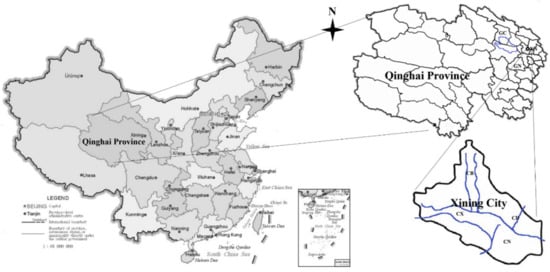 Distribution of the locations of sample collection in this study. Qinghai Province is located on the Qinghai-Tibet Plateau in China. The letter represents the sampling site (sampling site names shown in Table 1). Note: XN: Xining City, CD: Chengdong, CX: Chengxi, CN: Chengnan, CB: Chengbei, GC: Gangcha, GN: Guinan.