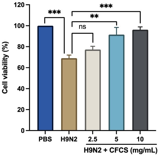 Cytopathic effect of the H9N2 virus. MTT assays were used to measure cell viability. Each experiment was performed three times, and the results are presented as a mean + standard error. To determine statistical significance, treatment groups were compared with control (PBS only) and H9N2 (no treatment). p-values: *** < 0.001, ** < 0.01. ns = non-significant.