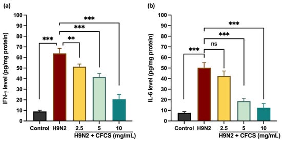 H9N2 virus-challenged mammalian kidney cells treated with CFCS show a reduction in interleukin levels. (a) IFN-γ and (b) IL-6. Results were presented as means + SE for the three experiments conducted in triplicate. p-values: ** < 0.01, *** < 0.001, ns = non-significant.