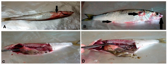 In the current study, the clinical inspection of naturally infected M. seheli revealed dark skin discoloration with detached scales (Figure 1A) and distinct hemorrhages at the base of the fins (Figure 1B). Moreover, the post-mortem findings of naturally infected M. seheli revealed hepatomegaly, friable liver with hemorrhagic patches (Figure 1C), and congested kidneys (Figure 1D).
