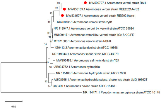 PCR amplification of the 16S rRNA gene was performed for all recovered A. veronii isolates. The retrieved A. veronii strains displayed congruence in their phenotypic features. Consequently, the PCR products of three isolates (chosen at random) were subjected to direct sequencing in both directions following purification using a PureLink PCR-Product purification kit (Thermo-Fisher Scientific, Bremen, Germany). The obtained sequences were placed in the GenBank with accession numbers MW831507, MW836109, and MW599727. Multiple alignments were performed on the obtained sequences. The phylogenetic tree was established according to the neighbor-joining approach with 1000 bootstrap resampling using MEGA X software [31,32].