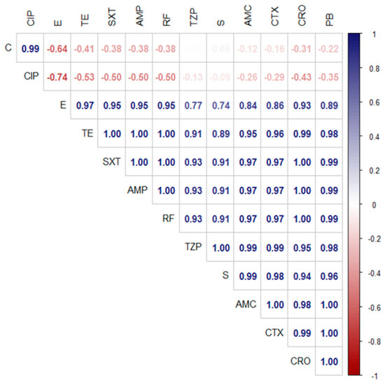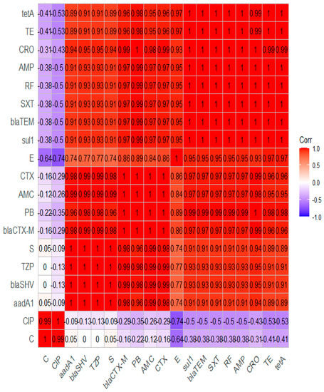 The correlation coefficient (r) between the tested antibiotics and the identified antimicrobial resistance genes.