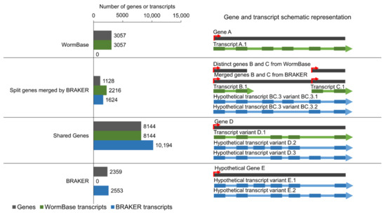 Distribution of different gene and transcript categories in the improved genome annotation. Left bar plots show the number of genes (grey) and transcripts predicted by the WormBase (green) or the BRAKER (blue) annotations. The schematic representations of different categories of genes and transcripts are shown on the right part of the figure. Rectangles represent exons, lines indicate introns, and arrows show the orientation of the genes/transcripts. Red arrows represent transcription start sites. WormBase: reference genes and transcripts which were only annotated by the WormBase; Split genes merged by BRAKER: fragmented genes in the WormBase which were merged by BRAKER prediction and their respective transcripts; Shared Genes: genes predicted both by WormBase and BRAKER genome annotations and their respective transcripts; BRAKER: novel hypothetical genes and transcripts predicted only by BRAKER genome annotation (Supplementary Data S2–S5).