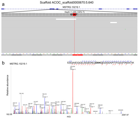 Polymorphism identified in gene product MSTRG.10219.1. (a) IGV screenshot showing G190T SNV from MSTRG.10219.1 transcript; (b) annotated tandem mass spectrum of a unique peptide from protein MSTRG.10219.1 showing G64C SAAV, which corresponds to G190T SNV.