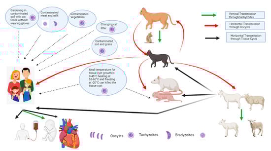 - Rahman, T.; Ashraf, T.; Rahman, A. Tracking trends of Toxoplasma gondii transmission from environment to animal to human. J. Adv. Parasitol. 2021, 8, 13–19. [Google Scholar] [CrossRef]