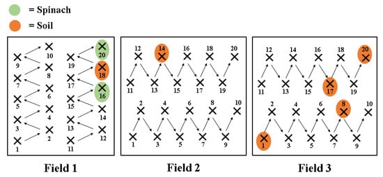 Soil (n = 60) and spinach (n = 60) samples were obtained from three different spinach fields in the same area in Co. Meath (north-east Ireland). Field 1 and Field 2 were adjacent to each other, while Field 3 was bordered by a sheep farm on one side and a dairy farm on the other (Figure 1). In each field, 20 soil and 20 spinach samples were collected in 250 mL Ramboldi sterile containers (Sparks Lab Supplies, Rathcoole, Dublin, Ireland) using sterile sampling scoops (VWR, Ballycoolin, Dublin, Ireland). Soil samples were collected from directly under the spinach plants tested. In addition, sampling was carried out in a zig-zag pattern to cover the entirety of the field (Figure 1). Samples were then transported in a cool box (at approximately 4 °C) to the laboratory for testing within 24 h. None of the fields had been amended with slurry in the 12 months prior to the sampling date.