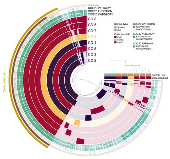 Pangenome analysis for the 8 C. difficile isolates from spinach fields. Gene clusters are indicated as opaque coloured elements and ordered based on their presence and absence, using the Euclidean distance and Ward clustering (inner dendrogram). Samples are hierarchically clustered based on the frequency of gene clusters (outer dendrogram). CD ‘number’ = C. difficile followed by the isolate ID.