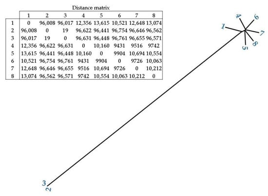 Phylogenetic tree of the C. difficile spinach (2 and 3) and soil isolates (1, 4–8) with the distances between isolates presented as a distance matrix.