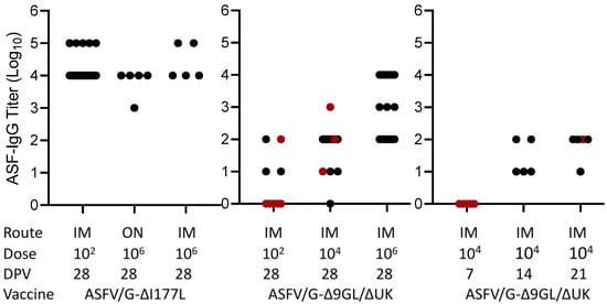 ELISA titers in sera obtained at the time of challenge in animals immunized with either ASFV-G-Δ9GL/ΔUK or ASFV-G-ΔI177L vaccine stains. Black dots and red dots indicate presence and absence of protection against the challenge, respectively.