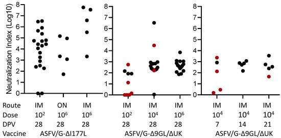 Neutralization index (NI) in sera of animals vaccinated with ASFV-G-Δ9GL/ΔUK or ASFV-G-ΔI177L vaccine strains and challenged with virulent field strain ASFV-G. Animals were grouped based on survival (black symbols) or absence of protection (red symbols) after the challenge. Asterisks indicate differences among groups (p < 0.05).