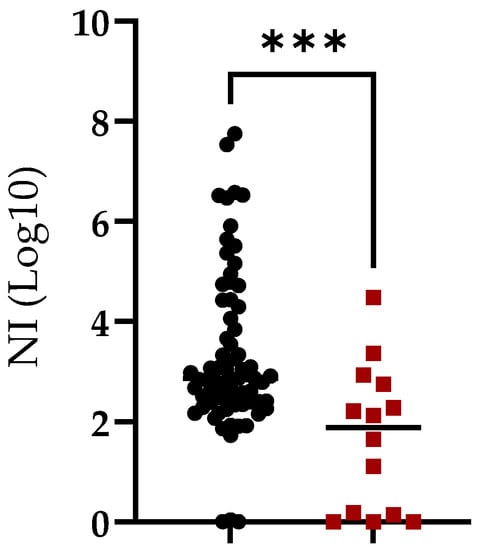 In the group of animals surviving the challenge, 95.7% of them demonstrated NI activity and only 3 out 70 (4.3%) failed to induce neutralizing antibodies against ASFV. Therefore, there was a strong association between survival after the challenge and NI activity. Our study, confirmed by ELISA (97.6%) and NI activity (95.7%) (Figure 3), suggests that survival from ASFV challenge is associated with the presence of antibodies.