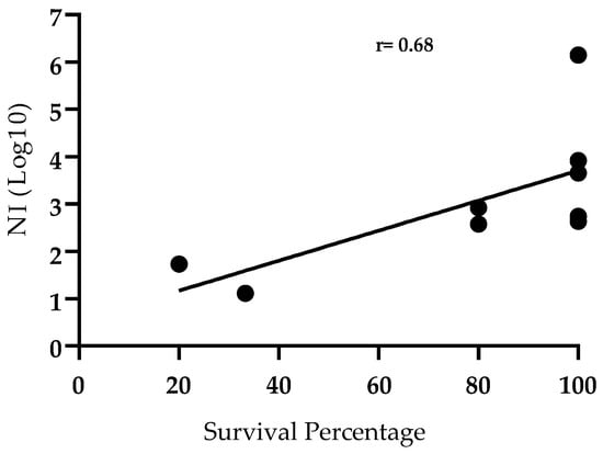 Correlation between protection after challenge and Neutralizing Index (NI) in sera of animals vaccinated with ASFV-G-Δ9GL/ΔUK or ASFV-G-ΔI177L vaccine stains. Survival percentage is represented by number of survivals groups described in Table 1. Pearson correlation coefficient r = 0.6841, p < 0.05; 95% confidence interval 0.0368 to 0.9271; P (two-tailed) 0.0421.