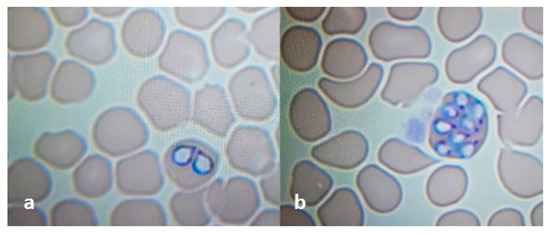 Babesia canis trophozoites (a) and merozoites (b) inside erythrocyte. Blood smears stained by the Diff-Quik method (100× magnifications, Nikon ECLIPSE E200).
