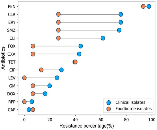 The patient isolates had significantly higher resistance rates to FOX than the food isolates (44.2% vs. 6.7%, p = 0.008), OXA (43.0% vs. 6.7%, p = 0.008), ERY (75.6% vs. 26.7%, p = 0.001), CLR (75.6% vs. 26.7%, p = 0.000), SMZ (74.4% vs. 26.7%, p = 0.001), and CLI (61.6% vs. 26.7%, p = 0.022). However, there was no significant statistical difference between patient and food isolates to other antibiotics. The resistance rates of patient isolates were 39.5% for TET, 29.1% for CIP, 25.6% for LEV, 19.8% for GM, 5.8% for RFP, and 3.5% for CAP. In food isolates, the resistance rates to these antibiotics were 40.0%, 13.3%, 0%, 6.7%, 0%, and 6.7%, respectively.