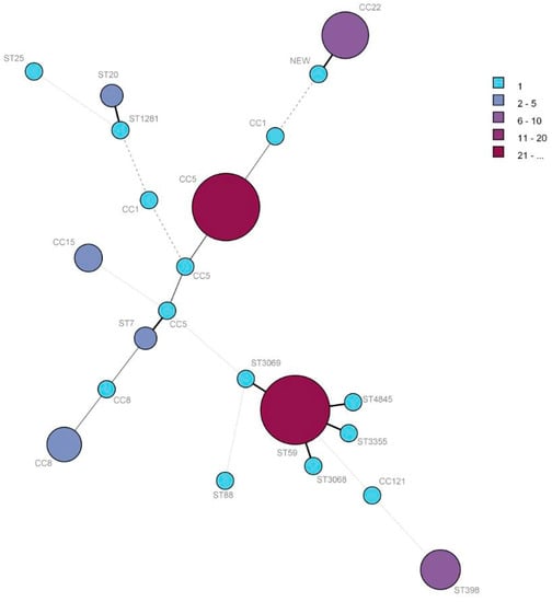 Phylogenetic tree of 86 patient S. aureus isolates based on MLST allelic profiles. Each circle represents CC type or singleton, and the size and color depth of each circle correspond to the number of samples (1, 2–5, 6–10, 11–20, and ≥21).