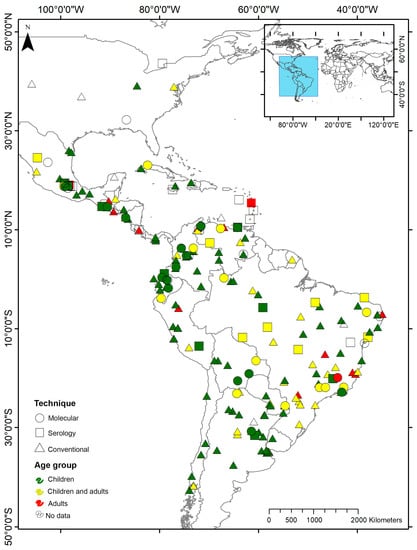 Of the 227 studies analyzed, 198 (86.8%) distributed samples by age group. Among them, 59.1% (117/198) were performed in children, 29.8% (59/198) in both children and adults, and 11.1% (22/198) exclusively in adults. Concerning the latter, these studies were performed on specific populations, such as immunocompromised individuals (chronic renal and HIV patients), pregnant women, migrants, food handlers, and blood donors, among others. In addition, these studies were mainly carried out in Brazil, and there were some records in Venezuela, Peru, and Central American countries (Figure 1).