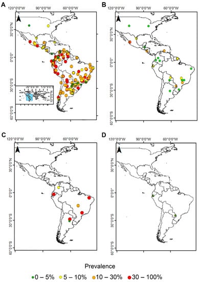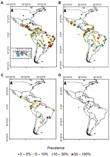 Maps showing the prevalence of Entamoeba species, which are morphologically identical, recorded among American countries studied: (A) Entamoeba complex, (B) E. histolytica, (C) E. dispar, and (D) E. moshkovskii.