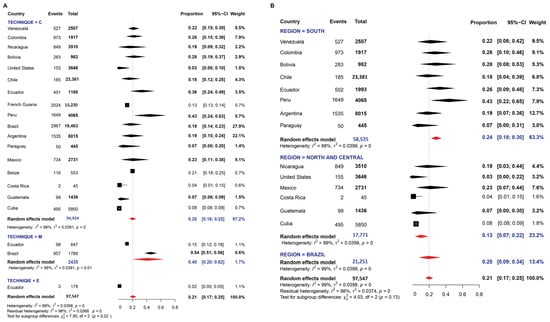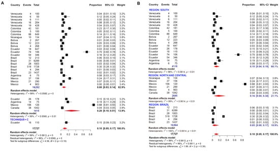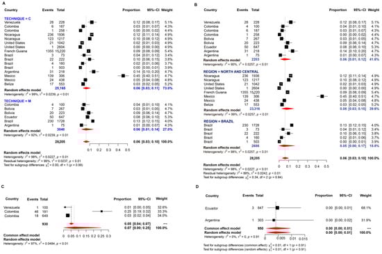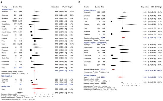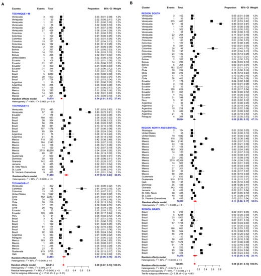 Due to the variability in the number of studies for each country, stratified meta-analyses were performed on data divided into three subgroups according to geographical regions: (i) North and Central American countries (Nicaragua, Mexico, United States, Guatemala, Belize, Costa Rica, Cuba), (ii) Brazil, and (iii) the other South American countries (Argentina, Bolivia, Chile, Colombia, Ecuador, French Guiana, Paraguay, Peru, and Venezuela).