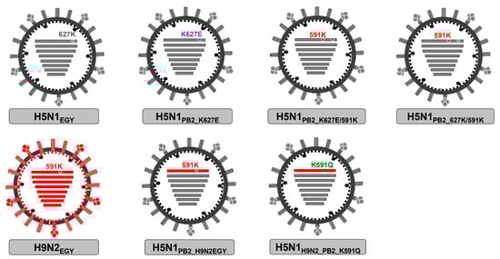 Viruses generated to study the differential impact of 591K and 627K in PB2 segments of H5N1 (grey) and H9N2 (red) viruses. The wt and mutated segments of all viruses were compatible and could be successfully rescued.