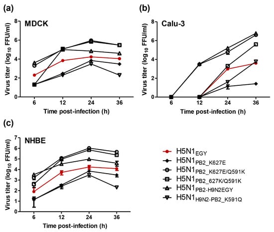 Herein, the recombinant H5N1 viruses showed diverse viral replication kinetics in various relevant mammalian and avian cell systems, emphasizing that PB2_627K/Q591K and PB2_K627E/Q591K in the PB2-H5N1 background increase viral replication efficiency in permanent and primary mammalian-type cells, including MDCK, Calu-3, and NHBE. This confirms that the PB2-591K can efficiently enhance the replication of the H5N1EGY virus, either alone or in combination with the PB2-627K. In contrast, the recombinant H5N1EGY viruses that carry PB2_K627E and H9N2-PB2_K591Q show replication performance at a minimal level in mammalian systems. Our results are comparable to Wang and his colleagues who showed similar effects of the Q591K mutation but in the backbone of the H9N2 virus [28].