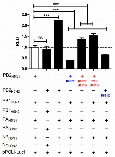 Polymerase activity of parent H5N1, H9N2, and other studied PB2 variants as measured by dual luciferase assay (n = 3). The significance was tested using a one-way analysis of variance ANOVA, followed by Dunnett’s multiple comparison post hoc test, and the significant differences are indicated (*** = p ≤ 0.001 and non-significant = ns).